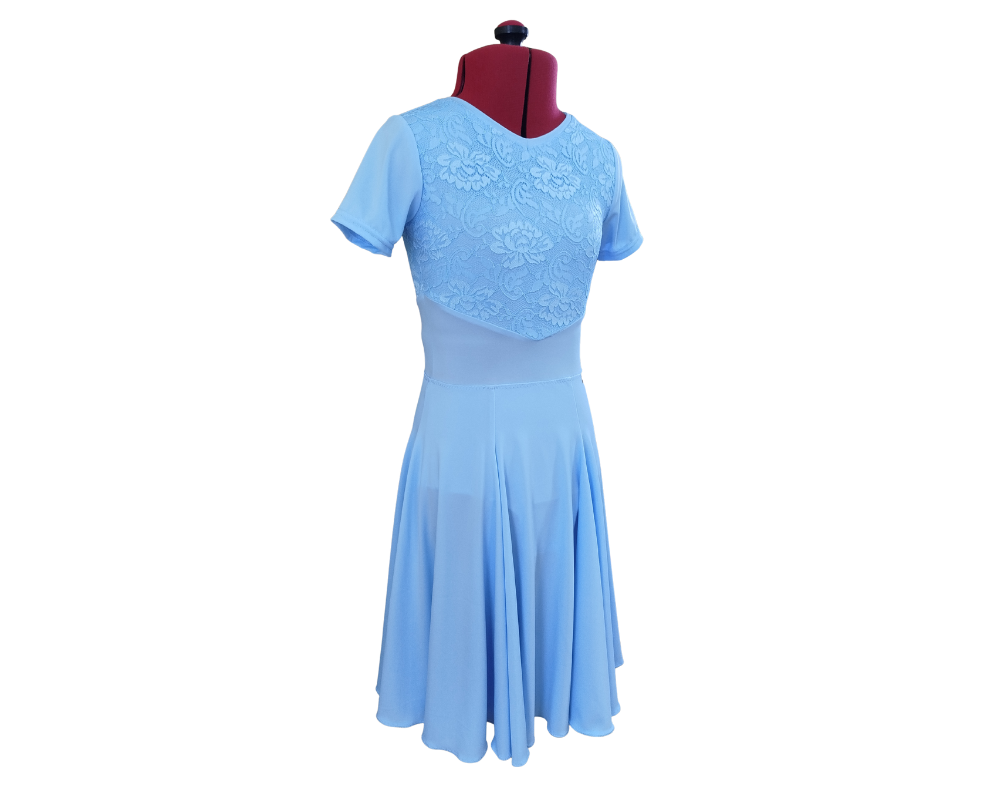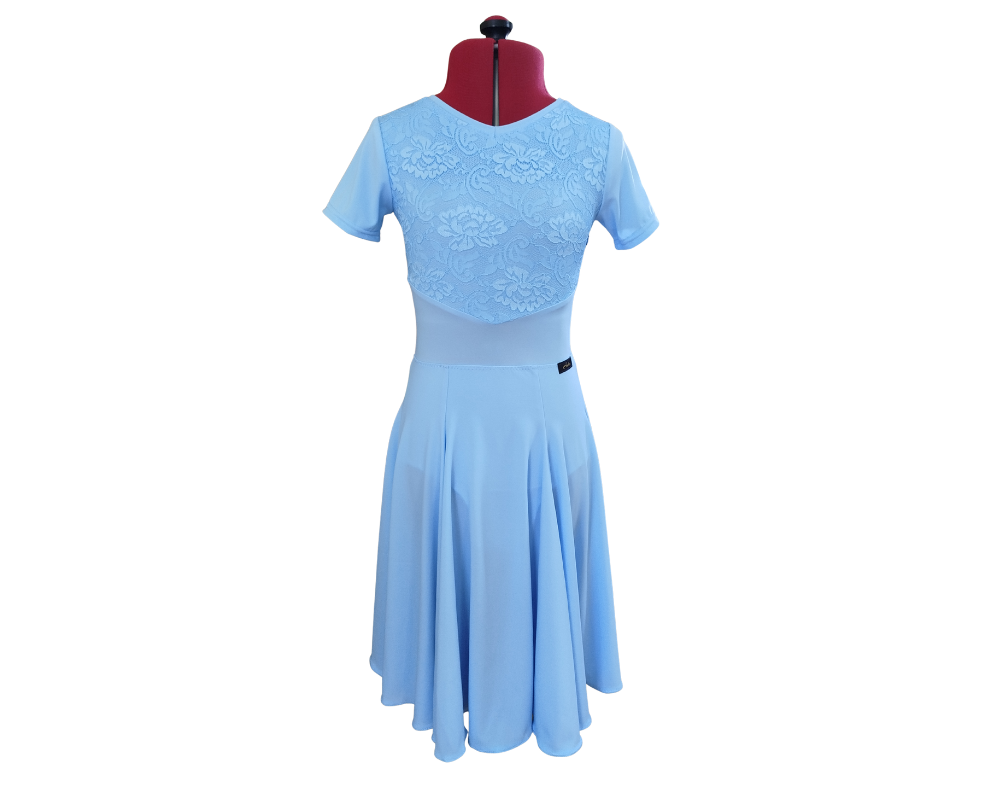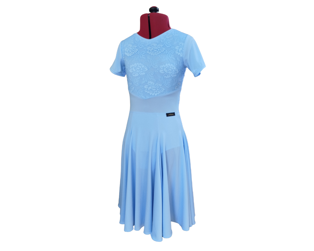 Lara dancesport dress with short sleeves, made from premium lycra and with lace in front and back. The one piece dress has a lycra panelled skirt, according to Romanian Dancesport Federation dress regulations.