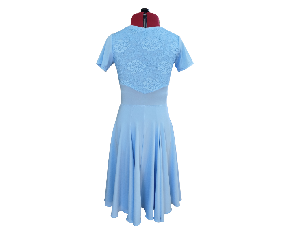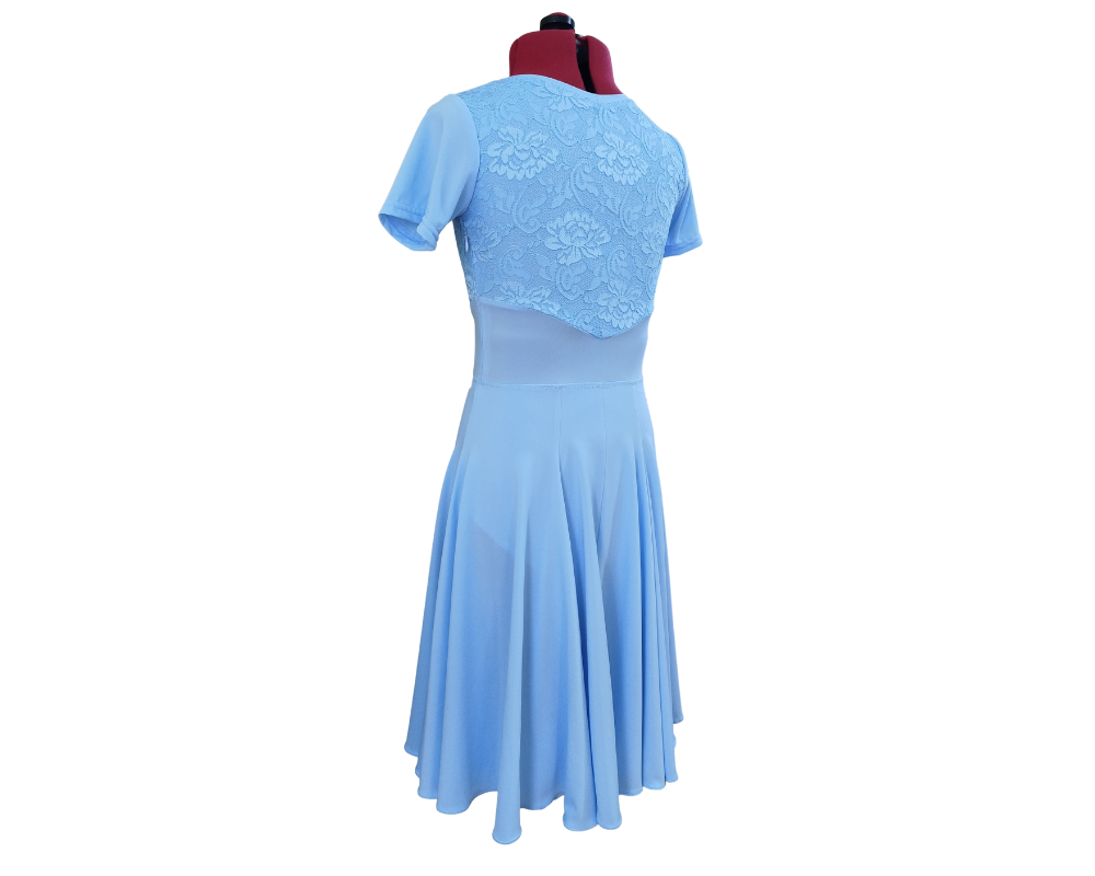 Short sleeve juvenile sportdance dress made from premium lycra and with lace in front and back.