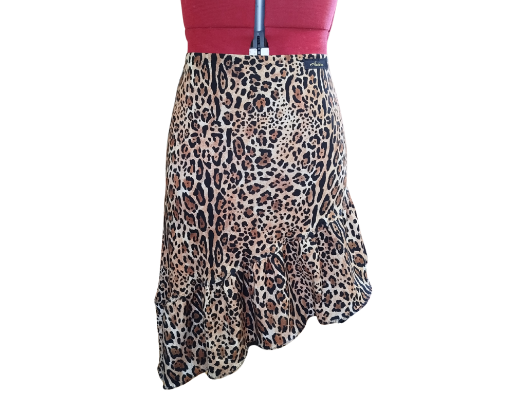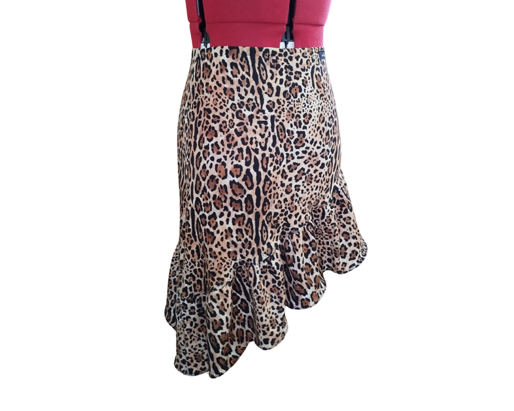 Asymmetric latin skirt perfect for practice, training camps or shows. The skirt follows the body, and it has a wide frill at the bottom. It’s made from premium lycra.
